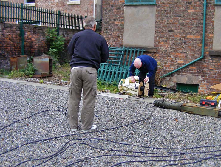 Bob G4NCI guiding the cable towards Neil G4OAR as he winds it on to the drum